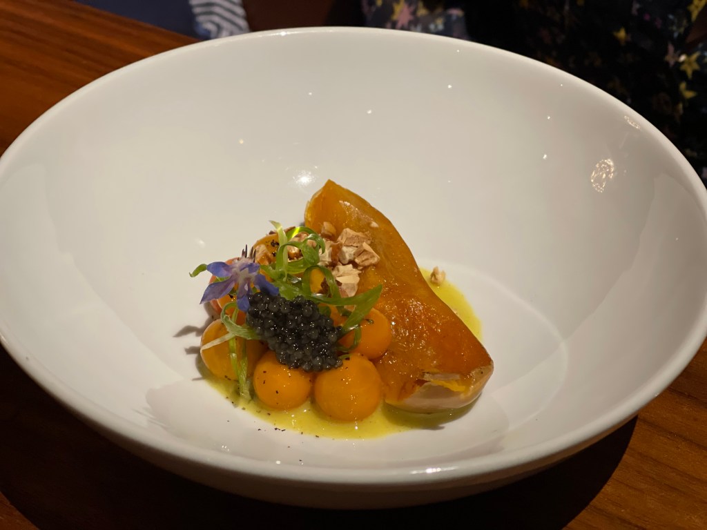 For the next course, roasted honeynut squash is paired with seasonal cherry tomatoes and caschews. To put some saltyness in the dish, the chef also prepared a dollop of caviar on the side. This inventive dish allows the sweet honey-flavored squash to be paired with the slightly sour tomatoes, as well as the caviar to give it some salty flair. (Rating: 4.5)