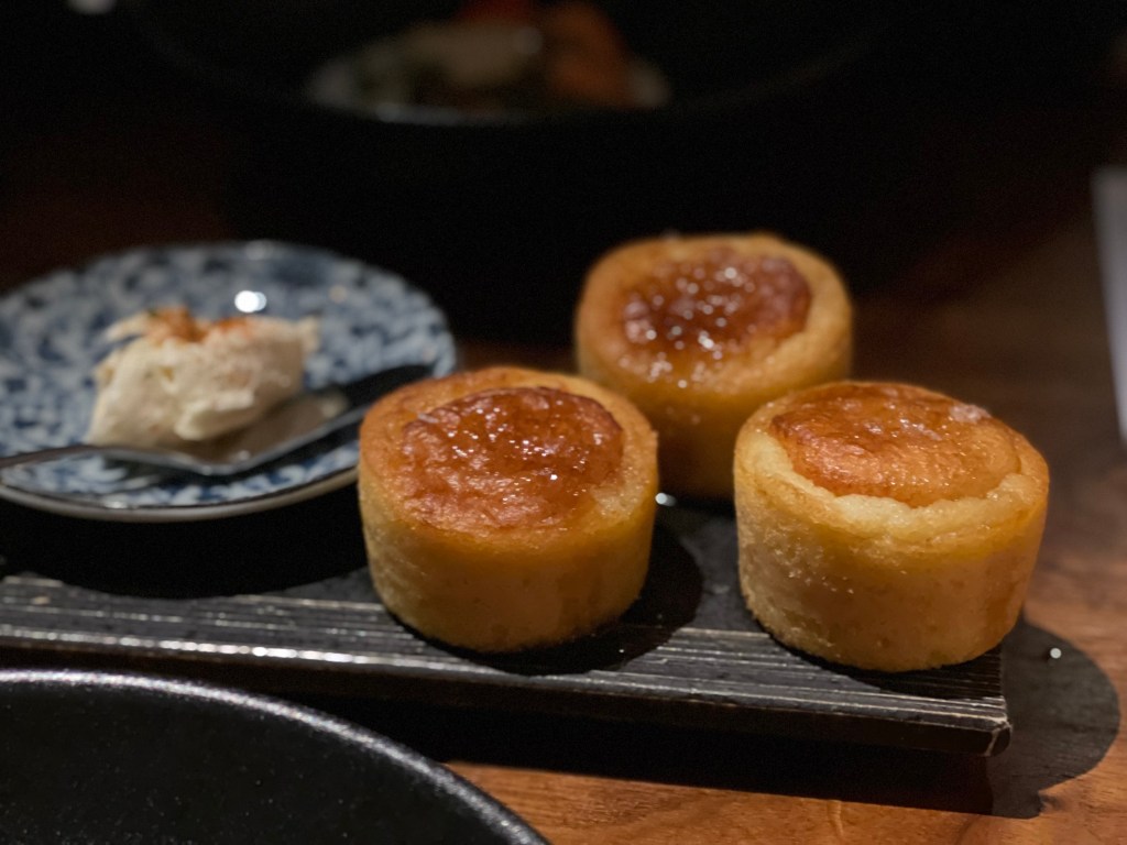 For the third course, we were given a bowl of satsuki rice with salmon, trout roe, and abalone. This porridge-like course was by far my favorite course because of how they added parmesan cream to give it that rich and savory taste along with that delectable seafood. (Rating: 5) The chef also prepared a bread course consisting of sweet corn-bread with aged olive oil.